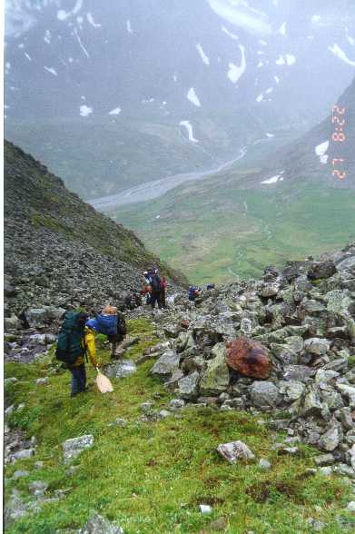 сухую погоду лучше идти в лоб. Только успели разведать перевал наверху (найти
