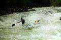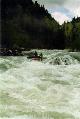 Повреждения: Две согнутые поперечины у ката Кирилла и Сереги, сломанная кница левого баллона третьей поперечины и погнутая в этом месте продолина у "Хавроньи". При разборе полетов были сделаны выводы, что в стабильном состоянии (нахождение Гули с катом в улове у левого берега под "Прощай Родина") не следует хватать первую попавшуюся морковку (которая может оказаться и без карабина) а ждать стопроцентного шанса. С параллельной группой возникли некоторые трения по поводу, что мы всей группой сняли страховку у "Прощай Родина" и ушли в догонку за перевернувшимся катом, создав тем самым трудности в прохождении порога их группе, четверка которой также ушла за Гулей. В наше оправдание можно привести доводы о том, что положение параллельной группы было конечно тяжелым, но не критическим, в отличии от нас, учитывая, что Гулю унесло в каньон и никакой информации о ней мы не располагали. Причем, учитывая далеко не нулевую вероятность оверкиля, в "Сосновом" нам могли понадобится все наши суда. 5 мая. Подъем в 7:00. Вышли в 10:19. До начала каньона "Малый Блып", заканчивающимся порогом "Щель" около 10-12 минут ЧХВ. Ориентир начала каньона - река делает правый, а затем крутой левый поворот, перед правым поворотом - входом в каньон у левого берега обломок скалы пиромидальной формы и завал плавника. Дорога подходит к реке и хорошо видна с воды. Через 150 м. крутой правый поворот с прижимом к скальному выступу и косой бочкой у левого берега. Проходили по внутренней стороне поворота, заходя у правого берега. Далее следует технический участок с маневрами между камней. На выходе из Каньона русло сужается и реку перегораживает бочка. Слева проносной язык, справа пенный котел. Кирилл с Серегой опять залегли. Кирилл зацепился за кат и его вынесло из бочки, Сергей остался полоскаться. Единственное, что мы успели это уйти чуть влево и упали в бочку гадая, не раздавили ли Сергея. Когда мы прошли бочку и я оглянулся назад у меня внутри все похолодело - Сергея в бочке не было. Правда спустя секунду я увидел его плывущего чуть правее нас. После выхода из "Щели" участок спокойной воды. Волков благополучно добрался вплавь (кролем) до берега, выпустив при этом весло, которое было поймано нашим катом. После поимки Серегиного весла мы и подоспевший Макс занялись спасением катамарана с Кириллом.Однако затолкать кат и плавающего рядом человека в улово не удалось. Кирилл был взят на борт (скорее на раму) двойки, а перевернутый кат был передан подоспевшей четверке. Кирилл был высажен на берег, а двойка и каяк ушли вдогонку за четверкой и перевернутым катом. Но, как оказалось, они и сами люди взрослые и, когда мы подошли, двойка уже была загнанна в улово (11:50). У девичьей двойки при прохождении каньона порвался упор и им пришлось зачалиться в середине каньона. Их ждали около часа (починить упор им помогали Макс с Лехой). в 12:50 отплыли дальше. До автомобильного моста (ориентир начала "Соленых скал" 10 минут ЧХВ. По дороге есть места для стоянок. Чалка за