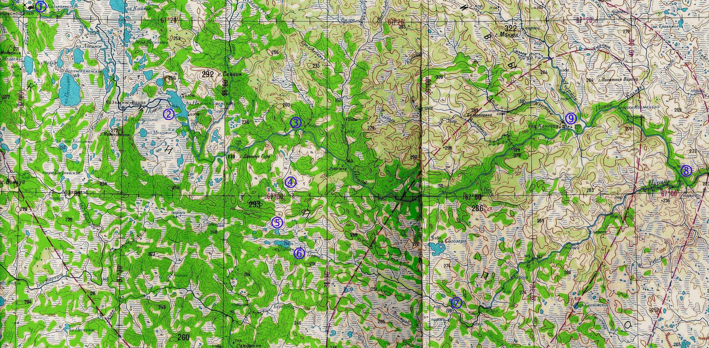маршрут, включающий прохождение до устья Поноя и потом пешком до Сосновки