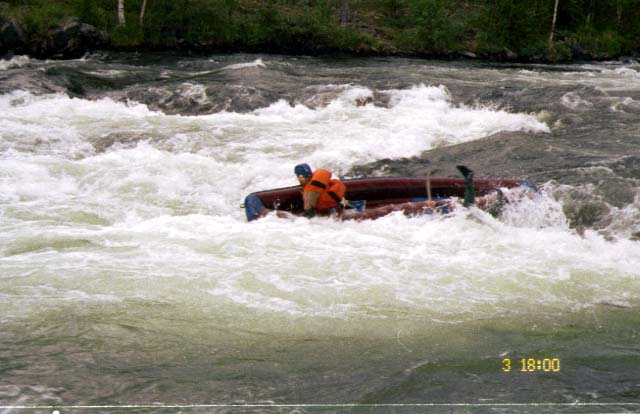 На выходе из Капустного порога имеется очень противная гряда. "ЛГ" сел на троллейбус настолько огромный, что Васе пришлось вылезать на него и проталкивать судно. "Сайгак" также присел, причем банка с тушенкой пробила герму и дно лодки. В результате была повреждена коробочка из-под кириного ремнабора и безнадежно испорчена пачка макарон. Здесь же на левом берегу мы вновь нашли комсомольцев, которые "расслабились, думали, что все кончилось", и сразу после нашего троллейбуса сели на другой и завязали классический галстук. Не помогли даже усиливающие слеги, которые лежали вдоль не только грузового отсека, как на "ЛГ", но вдоль всей лодки. Бедный "Таймень" был и так изрядно покоцан на Падуне. Я вернул комсомольцам стропорез, там же ими и забытый.
